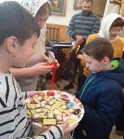 После дружного пения ребята подарили прихожанам украшенные атласные ленточки для закладок в молитвословы и другие книги духовного содержания. А от батюшки все получили по сладкому подарку – по шоколадке «Алёнка». По словам апостола Павла: «Вы же есте тело Христово, и уды от части» (1Кор.12:27). Сегодня, по милости Божией, мы имели радость духовно отпраздновать День прихожанина в единении душ всех присутствующих в храме вне зависимости от возраста.