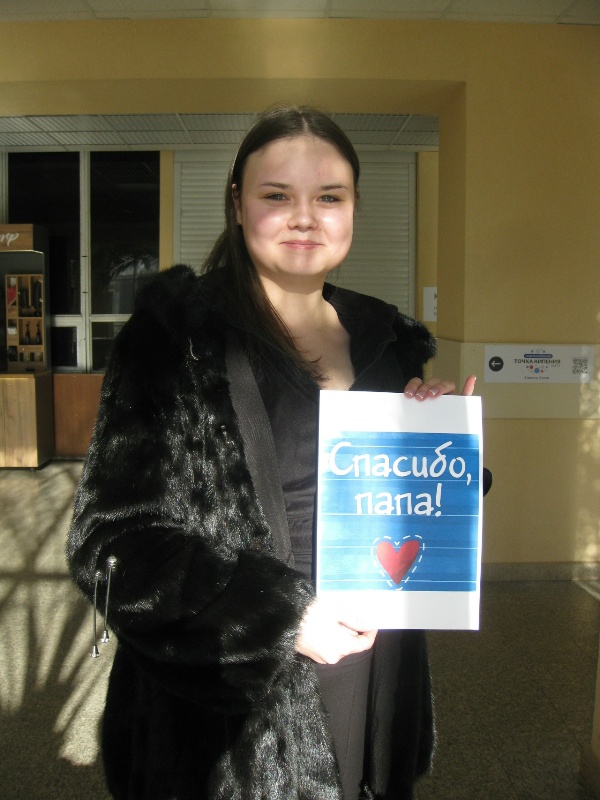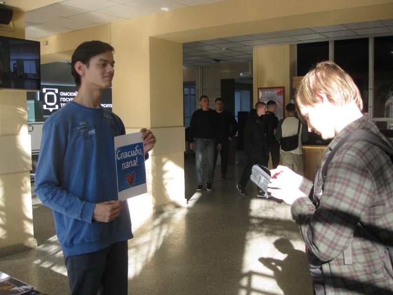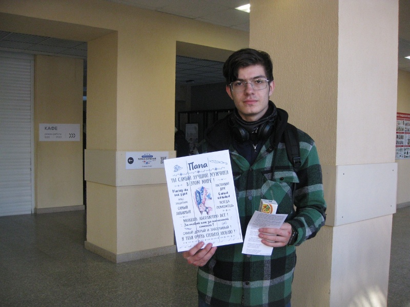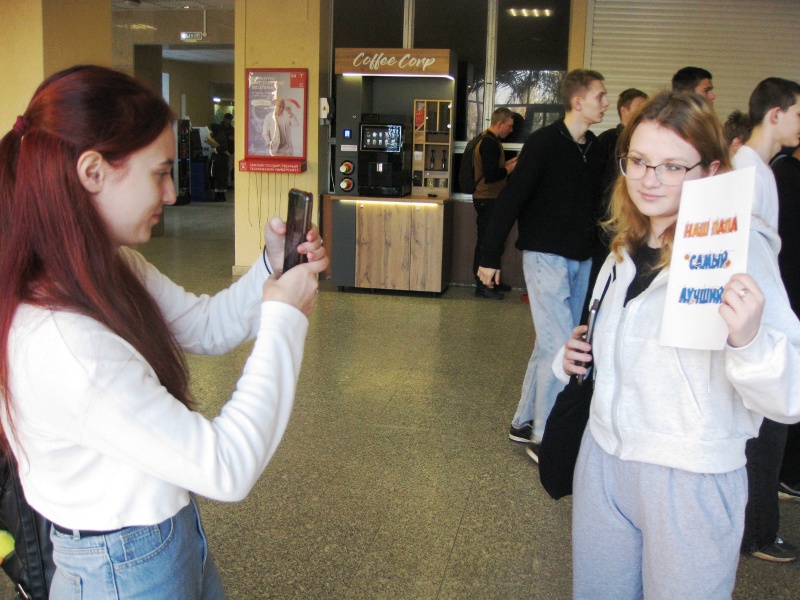 Студенты с воодушевлением приняли предложение сфотографироваться со специально подготовленными постерами, чтобы потом направить поздравительные фото своим папам.