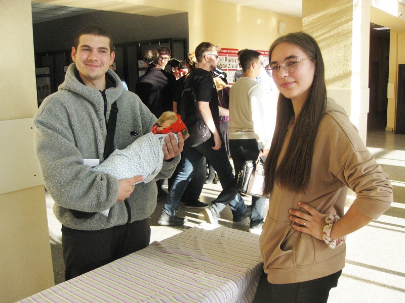 Большой интерес у студентов – будущих отцов вызвал процесс пеленания «младенца». Увидев последовательность пеленания, ребята бойко завертывали в пеленки «ребёнка», брали на руки, качали. По их лицам было видно трогательное и нежное отношение к происходящему.