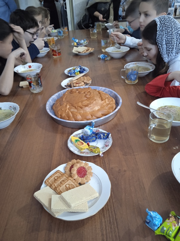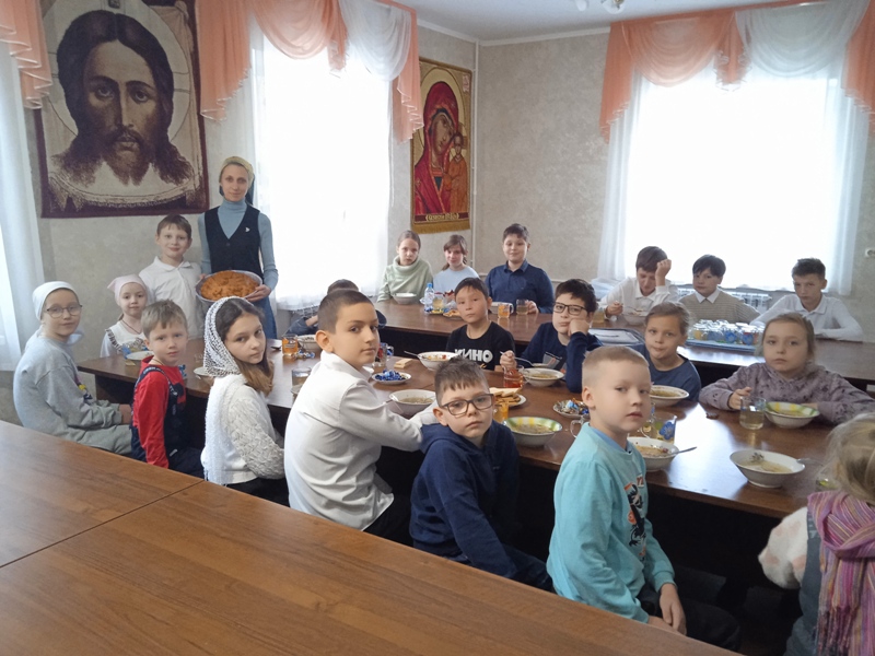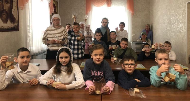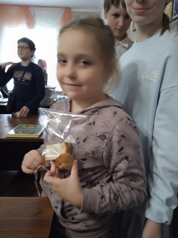 После совместной молитвы об окончании урока всех гостей и ребят угостили кусочком каравая, о котором они слышали в начале занятия. Удивительно, что его в точности хватило на всех присутствующих.