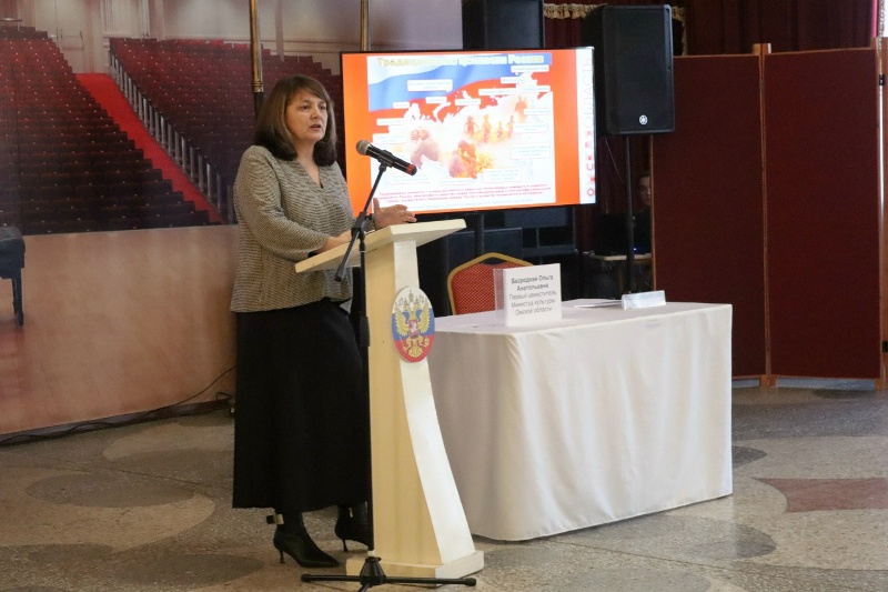 Далее вниманию слушателей представили свои доклады специалисты разных сфер культуры: Безродная Ольга Анатольевна, первый заместитель Министра культуры Омской области, кандидат исторических наук на тему «Реализация государственной политики по сохранению традиционных духовно-нравственных ценностей в деятельности учреждений культуры Омской области; Лобзова Ольга Николаевна, исполняющая обязанности заведующего кафедрой иконописи Омской Духовной семинарии, член Союза художников РФ, ведущий специалист по жанрам творчества бюджетного учреждения культуры Омской области «Государственный центр народного творчества» с темой «Особенности духовно - нравственного и творческого развития и образования средствами художественного искусства».