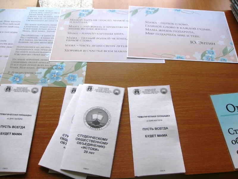 В четвертое воскресенье ноября в России отмечается День матери. Во время проведения площадки с экранов телевизоров, размещенных в корпусах ОмГТУ, демонстрировалась презентация, посвященная Дню мамы, в беседе со студентами рассматривали возможные варианты того, как можно красиво поздравить маму, по-особенному провести этот день. Стало традицией готовить специальные буклеты для раздачи во время проведения тематических площадок, они пользуются большим спросом у студентов.