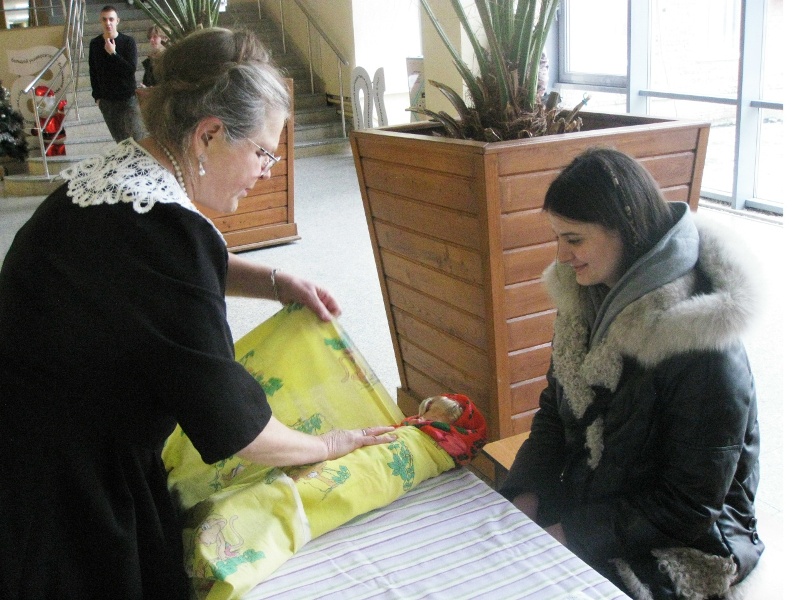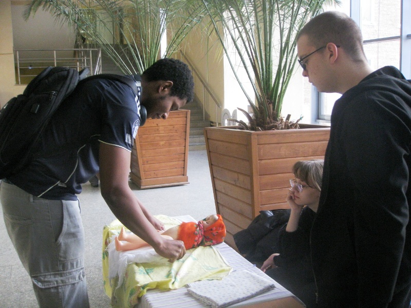 У всех желающих была возможность спеленать «ребенка», перекинуть мостик к своему младенчеству. Студент РТФ Салиф из Мали во время пеленания открывал для себя и тонкости русского языка.