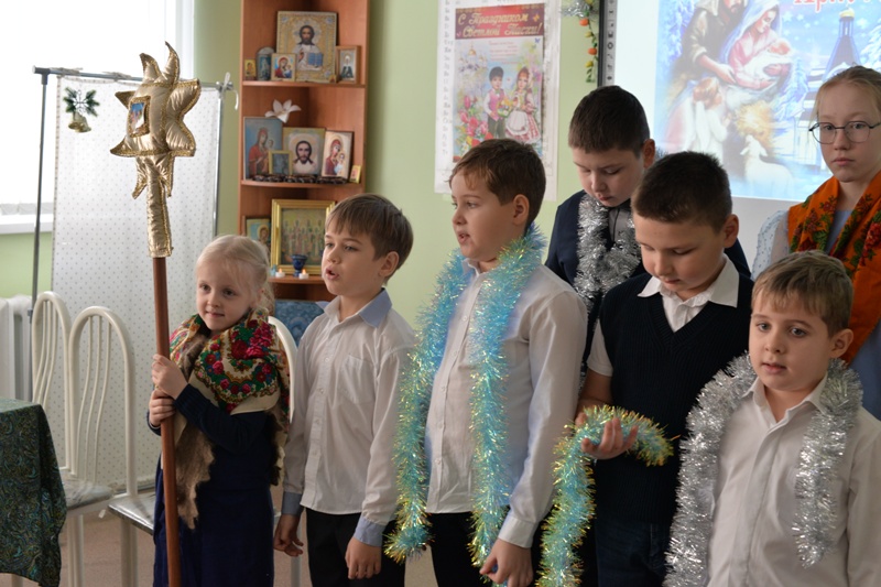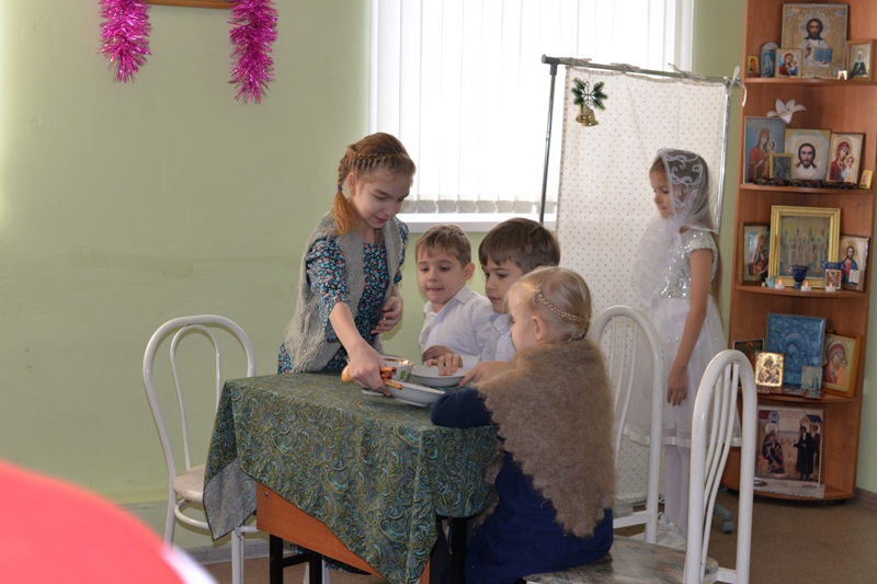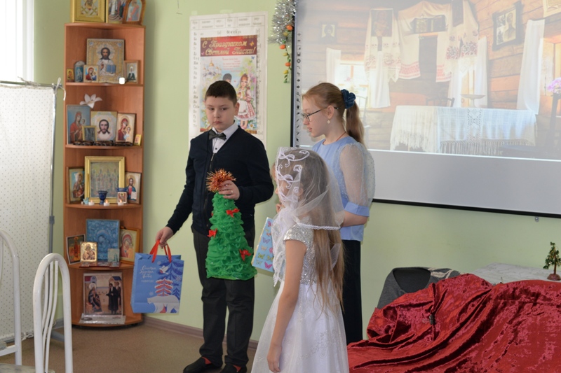 Силами воспитанников и педагогов была представлена постановка "Рождественский ангел", которая повествует о том, что нужно верить в чудо и Господь обязательно поможет. Так как идёт святочная неделя, ребята пропели колядки вместе с батюшкой Николаем и получили рождественские подарки.