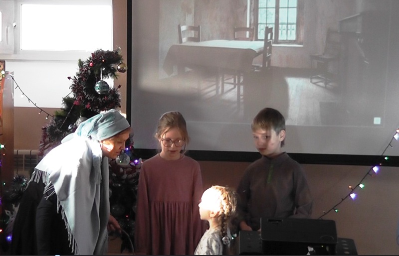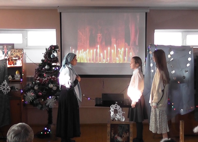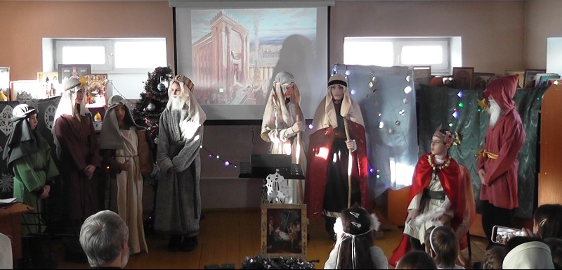 В это утро после Причастия старшие и младшие ребята поднялись наверх в класс с приготовленными заранее на каникулах совместно с родителями красивыми костюмами. Подготовились и учащиеся взрослой школы, они не только спели колядку, но и непосредственно участвовали и замечательно выступили с детьми в рождественском спектакле!