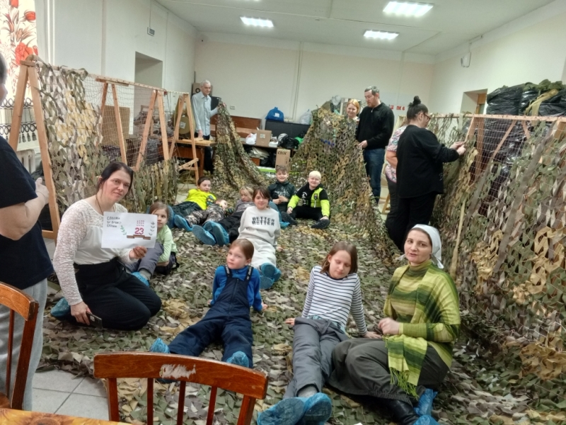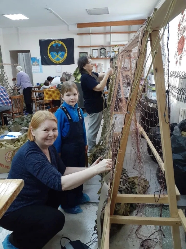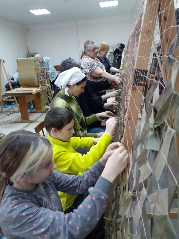 После музыкальной части занятий мы с детьми и взрослыми приступили к плетению маскировочных сетей. Это очень увлекательное и успокаивающее занятие. Одна часть воспитанников осваивали метод плетения "Джишка", другая часть встали за резательный агрегат (под руководством мастера), а третья часть деток писали письма на фронт и рисовали открытки для наших Защитников Отечества.