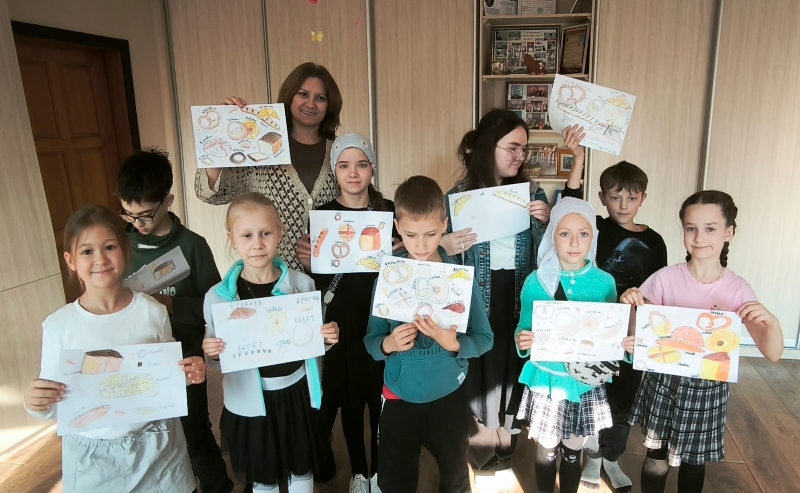 Во второй половине урока детям рассказали об истории калача, и ребята, под руководством педагога Светланы Маликовны, нарисовали красочные рисунки, на которых изобразили различные виды хлебушка.