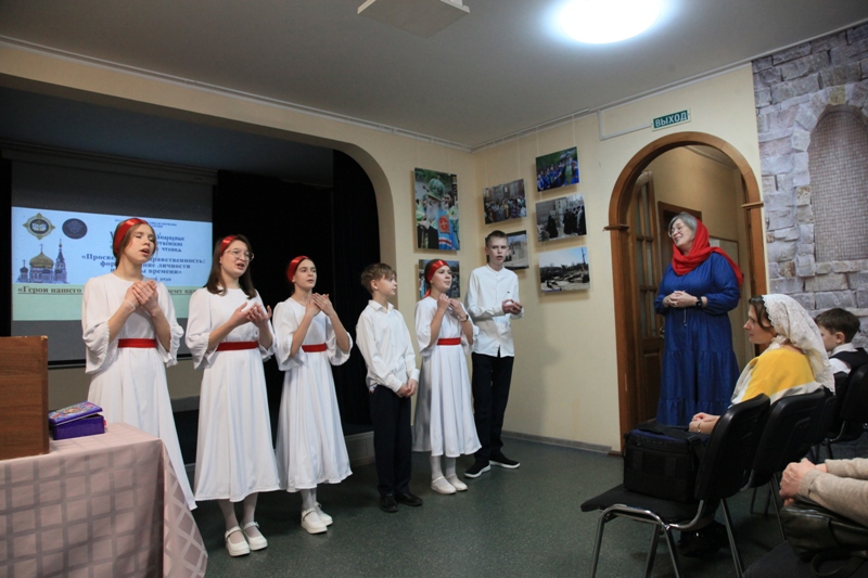 Открыл работу секции небольшой концерт приходской школы пения «Антифон». А самое первое сообщение называлось «Мой Президент» и было посвящено нашему российскому президенту. С большим уважением и благодарностью воспитанница детской воскресной школы собора Рождества Христова Валерия Чухлебова рассказала о биографии Владимира Владимировича Путина, о его трудолюбии, волевых качествах характера и крепкой православной вере.