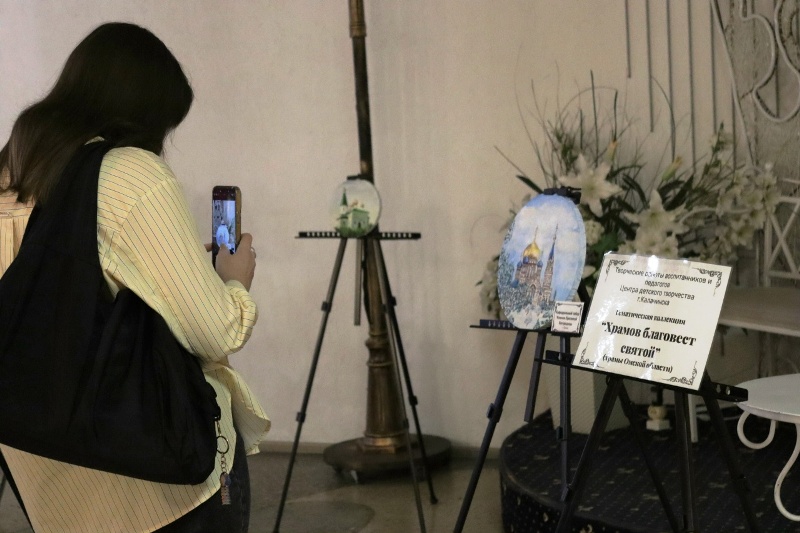 Перед началом работы секции педагогами бюджетного образовательного учреждения дополнительного образования города Калачинска Омской области «Центр детского творчества» была представлена тематическая выставка картин «Храмов благовест святой» созданная учениками центра.