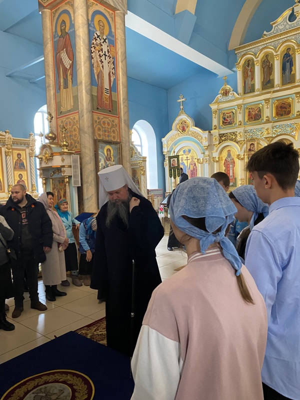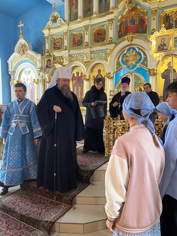 Богослужение завершилось славлением Пресвятой Богородицы перед Ее образом, а затем владыка поздравил прихожан храма с престольным праздником и подарил воспитанникам воскресной школы сладкие фрукты. В продолжении праздничных мероприятий гостей и прихожан пригласили на совместную торжественную трапезу.