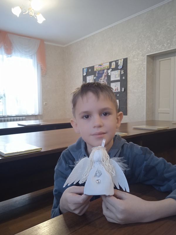 Отдельно сделали Ангелочка и для батюшки Вячеслава. Ещё дети показали гостям открытки для постояльцев Куйбышевского пансионата, которые они делают в свои дома и приносят в воскресную школу, в надежде, что они подарят счастье этим людям при встрече в период Святок.