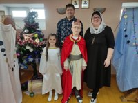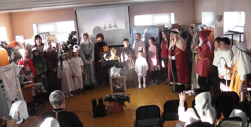 В это утро после Причастия старшие и младшие ребята поднялись наверх в класс с приготовленными заранее на каникулах совместно с родителями красивыми костюмами. Подготовились и учащиеся взрослой школы, они не только спели колядку, но и непосредственно участвовали и замечательно выступили с детьми в рождественском спектакле!