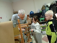 После музыкальной части занятий мы с детьми и взрослыми приступили к плетению маскировочных сетей. Это очень увлекательное и успокаивающее занятие. Одна часть воспитанников осваивали метод плетения "Джишка", другая часть встали за резательный агрегат (под руководством мастера), а третья часть деток писали письма на фронт и рисовали открытки для наших Защитников Отечества.