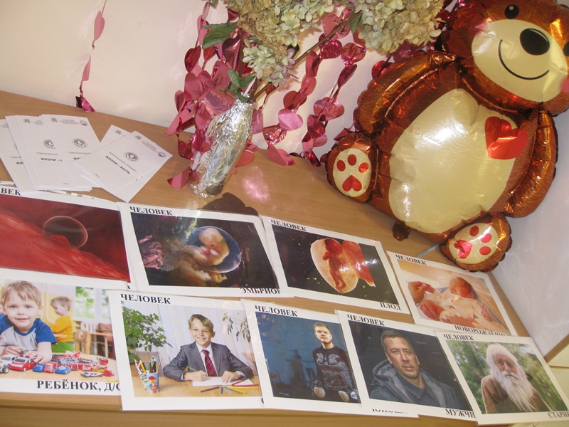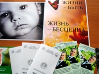 Вниманию студентов была представлены фотографии человека в разном его возрасте – от эмбриона до старика; для раздачи подготовлены буклеты «Жизни – Быть» и «Береги честь смолоду».